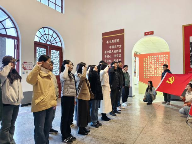 在庄严肃穆的纪念馆内,全体人员跟随讲解员的引导,认真观看了陈列的历史图片、珍贵文物和文献资料,详细了解了毛主席视察黄楼时的历史背景、具体情景及其深远意义。参观学习过程中,学生党员不时驻足交流,被革命先辈坚定的理想信念和为人民事业不懈奋斗的精神深深打动;参观结束后,全体人员面向党旗,庄严地举起右拳,重温入党誓词。大家纷纷表示,这次主题党日活动是一次深刻的思想洗礼和党性教育,更加清晰地认识到自身肩负的历史使命与时代责任。