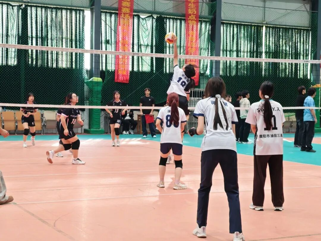赛场上,队员发球势如破竹、扣杀雷霆万钧、拦网铜墙铁壁、救球流星赶月。飞身扑救、跃起扣杀、精妙传球间,尽显对胜利的渴望与团队信任;失球互勉 “稳住再来”,得分击掌相拥。