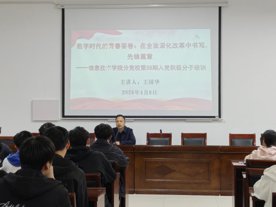 4月8日,信息技术学院分党校于三商楼112会议室举办了第58期入党积极分子专题党课培训,党委书记王国华以“数字时代的青春答卷:在全面深化改革中书写先锋篇章”为题,为学院第58期入党积极分子讲授专题党课。